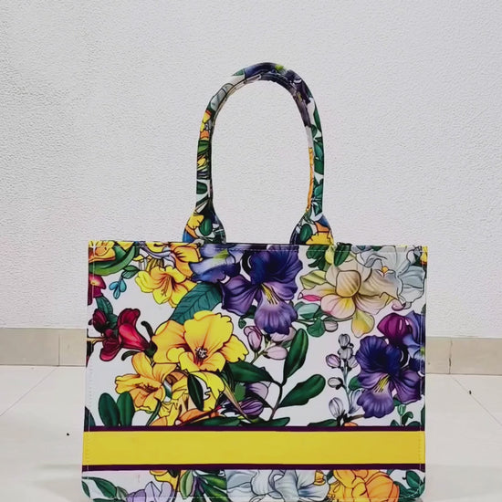 Description: This bag is a celebration of color on a white background. It is covered in a lush, detailed arrangement of bright flowers, prominently featuring purple and yellow pansies or similar blossoms. The overall look is cheerful and high-contrast. The handles are a vivid blend of orange, red, and yellow, and the bottom stripe is a bold, warm yellow.