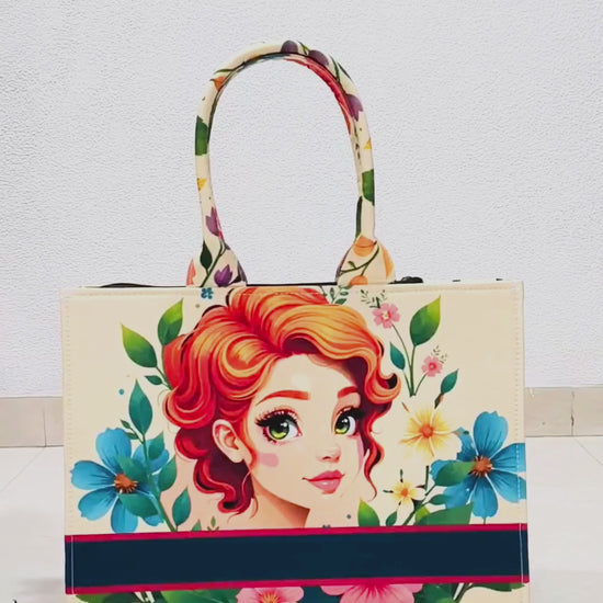 Description: This bag has a bright, cheerful illustration of a woman's portrait with vibrant orange/ginger hair set against a backdrop of bold, stylized flowers, including large blue blossoms and pops of yellow and pink. The artwork style is expressive and eye-catching. The bottom stripe is a contrasting deep navy blue bordered by thin red and green lines.